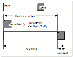 Il rsulte de cette description que l'on doit slectionner les vnements ButtonPress sur la barre pour capter l'enfoncement du bouton, et slectionner les mouvements de souris avec le masque ButtonMotionMask pour capter les mouvements qui se produisent quand un bouton de la souris est enfonc. On doit galement slectionner les vnements ConfigureNotify ( l'aide du masque StructureNotifyMask) sur la barre pour capter les changements de taille de la barre et rajuster la hauteur de la tirette en consquence. On aurait pu slectionner aussi les vnements souris sur la tirette, mais cela n'est gure ncessaire ici du fait de la propagation des vnements. Un vnement qui se produit sur la tirette sera de toute faon propag la barre[8].
