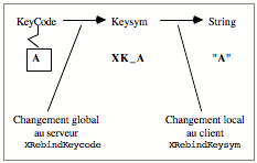 On peut en effet modifier les chanes de caractres ASCII associes par XLookupString (dans le buffer) au code symbolique keysym grce la fonction XRebindKeysym. Cette redfinition est locale au client. Elle ne modifie que les rponses aux futurs appels XLookupString mis par le client (cf. figure 5.5.).