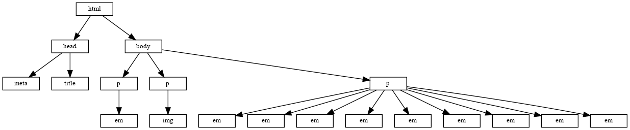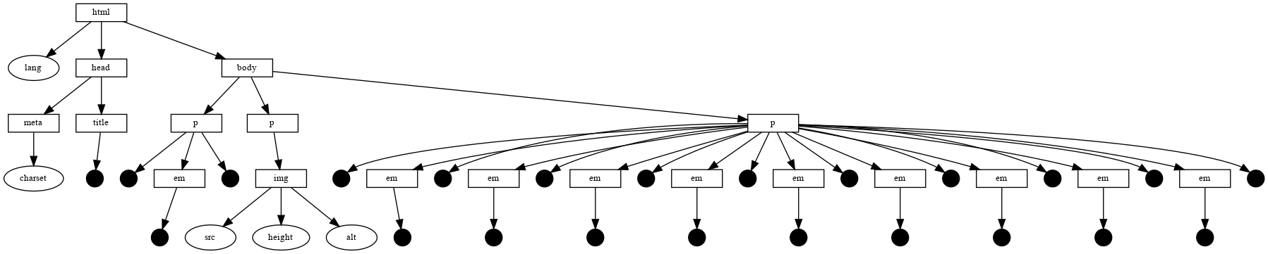 Reprenez le résultat de l'exercice 4. Tracez sur une feuille de papier l'arbre du document, d'abord sans les nœuds attributs ou textes, puis en rajoutant les nœuds attributs, puis les nœuds texte (juste leur présence).