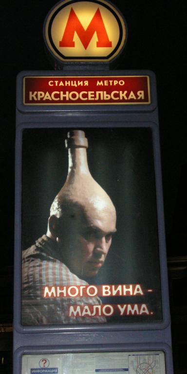Retour à Moscou ensuite. Après la pluie, le vent et les 4° du début Mai petersbourgeois (mais la mer n'était plus gelée quand même), la canicule à Moscou. Plus de 30° en Mai, c'est ça de s'acheter un climat continental ! Heureusement la ville a pensé à tout puisque, histoire de nous rafraîchir sans doute, l'eau chaude a été coupée chez moi du 11 au 28 Mai. 12° à la sortie du robinet, ça fait frisquet pendant 17 jours...Mais rien que de très normal, tous les quartiers y passent, chacun à leur tour, pour semble-t-il vidanger et nettoyer les canalisations à la fin de l'hiver. Etonnant non ? En tous les cas, c'est bien agréable de découvrir Moscou sans neige, de pouvoir enfin se balader longtemps sans crainte de finir amputé de deux pieds gelés. La vraie saison des bières commence ! Même si j'ai vu pas mal de Russes la bière à la main (nue) par -10°, il y en a beaucoup plus maintenant. Et comme les bouteilles sont consignées pour une somme ridicule, les gens les laissent bien en évidence partout afin qu'elles soient ramassées par plus pauvres qu'eux. Et puis c'est aussi la saison des gens complétement torchés qui traînent un peu partout dans la ville qui commence. Par exemple en bas de chez moi, dans une ruelle sous un arbre, il y a une sympathique petit table et ses bancs installés, où chaque jour quelques locaux (assez âgés) préparent leur vodka maison (de l'alcool à 90° non modifié en petites bouteilles bleues et de l'eau) et discutent jusqu'à tomber par terre - du coup j'en vois régulièrement un ou deux allongés à même le sol, dès le matin quand je pars au labo parfois...Pourtant le gouvernement semble vouloir lutter contre ça. Après l'échec de la prohibition Kruchëvkienne (et ses jarres de vin maison fermées par un gant en latex - appelées "bonjour Kruchëv"), Lujkov a interdit la consommation de vodka sur la voie publique (je l'ai appris presqu'à mes dépends), et même de bière depuis Mai paraît-il, bien que les policiers eux-mêmes contredisent ce dernier point. Enfin y'a encore du boulot...faut avouer que les pubs genre "mnogo vina, malo uma" (cf ci-dessous) ne sont pas génialissimes.